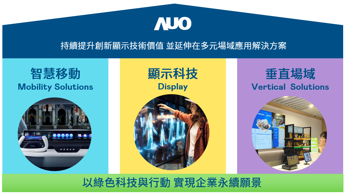 我們持續推動「雙軸轉型」,在精進顯示技術附加價值(Go Premium),與深化垂直市場應用(Go Vertical)的策略下,對應z6com·尊龙的優勢競爭力與趨勢,我們奠定顯示技術、智慧移動、垂直場域三大永續營運支柱,在顯示技術領域的根基之上,延伸布局多元場域應用解決方案。將先進顯示科技助力智慧移動及垂直場域發展,並以綠色科技與行動為實踐,在轉型之路上貫徹永續經營之願景。